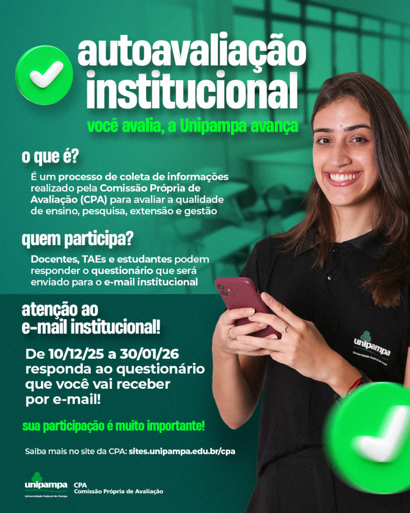 Entre os dias 10 de dezembro de 2025 e 30 de janeiro de 2026, fique atento ao e-mail institucional. Por meio dele, a CPA envia convite com link individual para participação no processo avaliativo.
