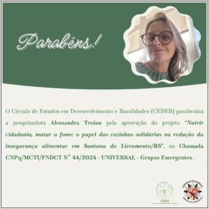 O grupo de pesquisas CEDER parabeniza a pesquisadora Alessandra Troian, coordenadora, e os demais pesquisadores do grupo – Alexandre Troian, Mitali Daian Alves Maciel, Sibele Vasconcelos de Oliveira, Samanda Silva da Rosa, Katia Mariel Figueroa  e Maiara de Andrade dos Santos – pela aprovação do projeto Nutrir cidadania, matar a fome: o papel das Cozinhas Solidárias na redução da Insegurança Alimentar em Santana do Livramento/RS no Edital Universal do CNPq, Chamada CNPq/MCTI/FNDCT Nº 44/2024 – FAIXA A – Grupos Emergentes.