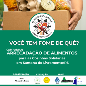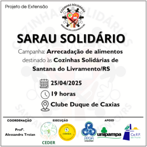 O Sarau Solidário foi o evento de lançamento do projeto de extensão intitulado “Você tem fome de quê? Campanha de arrecadação de alimentos para as Cozinhas Solidárias de Santana do Livramento/RS”. O projeto visa promover ações de coleta e distribuição de alimentos para as Cozinhas Solidárias do município através de ações de