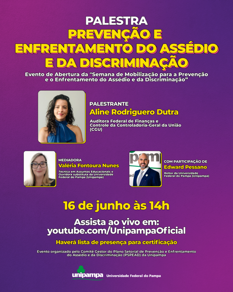 Foi realizada a Palestra com o tema “Prevenção e Enfrentamento do Assédio e da Discriminação”, no dia 16/06/2025, às 14 horas, no YouTube Unipampa Oficial.