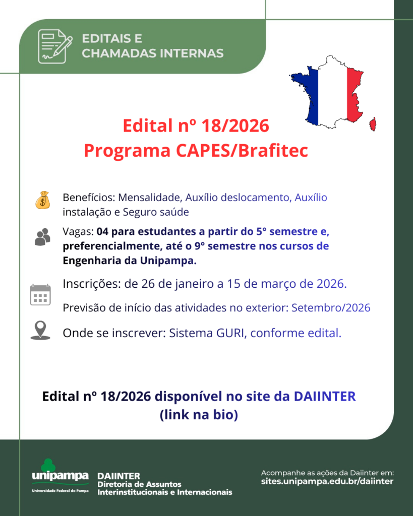 Lançamos o edital interno para a pré-seleção de estudantes de graduação interessados em um período de mobilidade acadêmica em instituição de ensino superior na França, através do Programa CAPES/Brafitec.