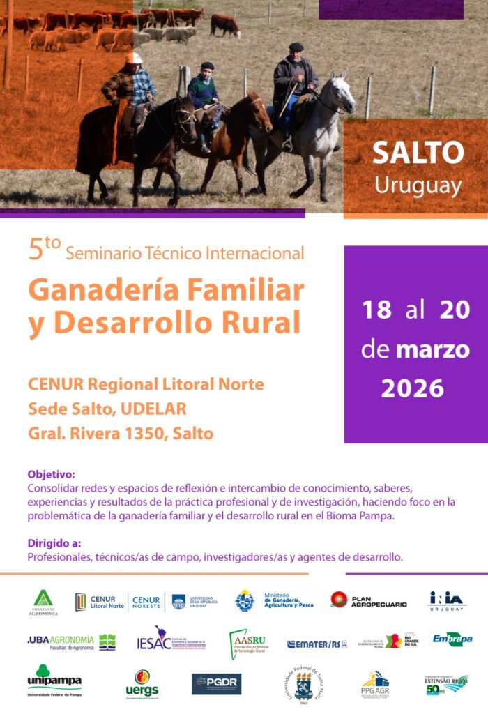 A Universidade da República (Udelar) e a UNIPAMPA, entre outras IES da região, convidam para o 5º Seminário Técnico Internacional “Ganadería Familiar y Desarrollo Rural”, que será realizado na cidade de Salto (Uruguai), entre os dias 18 e 20 de março de 2026.