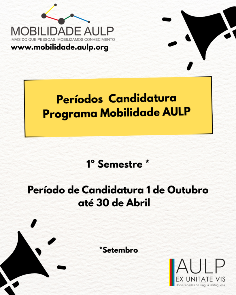 O Programa de Mobilidade AULP, cujo período de candidatura decorre até 30 de abril de 2026, visa facilitar a mobilidade e a acreditação acadêmica, através da promoção do intercâmbio de informações, da flexibilização curricular, da transferência e definição comum de créditos, bem como da valorização das atividades formativas.