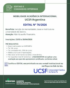 A Unipampa e a Universidade Autônoma de Entre Ríos (UADER), na Argentina, mantém uma cooperação estratégica que abrange diversas frentes: ✈️ Intercâmbio: Mobilidade para estudantes, docentes e pesquisadores; 🔬 Ciência: Desenvolvimento de estudos e pesquisas em conjunto; 📚 Conhecimento: Compartilhamento de publicações e acesso a acervos das bibliotecas; 🤝 Eventos: Participação em seminários, colóquios e simpósios binacionais.