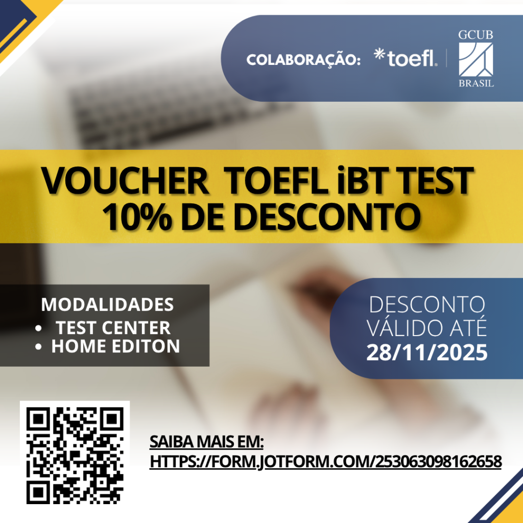 Como instituição associada ao Grupo de Cooperação Internacional de Universidades Brasileiras – GCUB, a Unipampa divulga a parceria do Grupo com a Educational Testing Service (ETS), que concede nova oportunidade para solicitação de voucher com desconto de 10% para a realização do Exame TOEFL iBT. Esse desconto é exclusivo para professores(as), estudantes, técnicos(as) e pesquisadores(as) das universidades associadas ao GCUB.