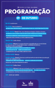 Na quarta-feira dia 8/10, nesse espaço, foi feita a apresentação de um curta-metragem feito com recursos do Edital PROARTE, conduzido pela Pró-Reitoria de Extensão e Cultura (PROEC). Bruna Berkai da Silva Santos, diretora e roteirista, é a vice-diretora do GRISCU (Grupo de Estudos de Relações Internacionais, Sociedade e Cultura). O grupo debateu sobre os desafios dos estudantes que vem de outros lugares do Brasil e também foram apresentadas as características do Edital.