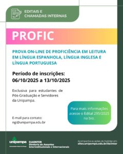 O Núcleo de Gestão de Idiomas da Daiinter divulga o Edital nº295/20255 de inscrição para realização de Prova ON-LINE de Proficiência em Leitura em Língua Espanhola, Língua Inglesa e Língua Portuguesa para Estrangeiros(as) e Surdos(as) – PROFIC, destinado a alunos(as) de Pós-graduação stricto sensu e servidores TAE e docentes da Unipampa.