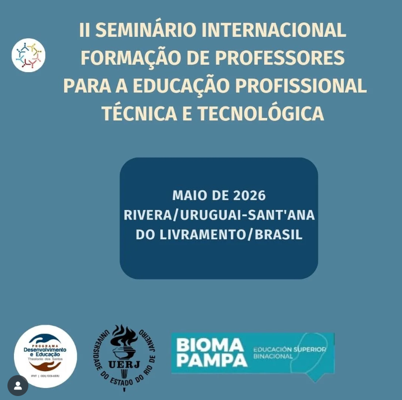 A Rede Bioma Pampa de Instituições Públicas de Educação Superior (RBPIPES) e o Programa de Desenvolvimento e Educação – Theotonio dos Santos (ProDEd-TS) da UERJ anunciam e convidam para o II Seminário Internacional de Formação de Professores para a Educação Profissional Técnica e Tecnológica, que acontecerá em maio de 2026 na fronteira Livramento (Brasil)-Rivera (Uruguai)