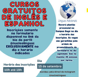 As inscrições para os cursos de idiomas ministrados pelo Núcleo de Línguas da Unipampa ocorrerão exclusivamente no dia 15 de setembro (segunda-feira)das 10h às 19hpelo formuláriohttps://forms.gle/WbvGd1df4T9kCnPu7