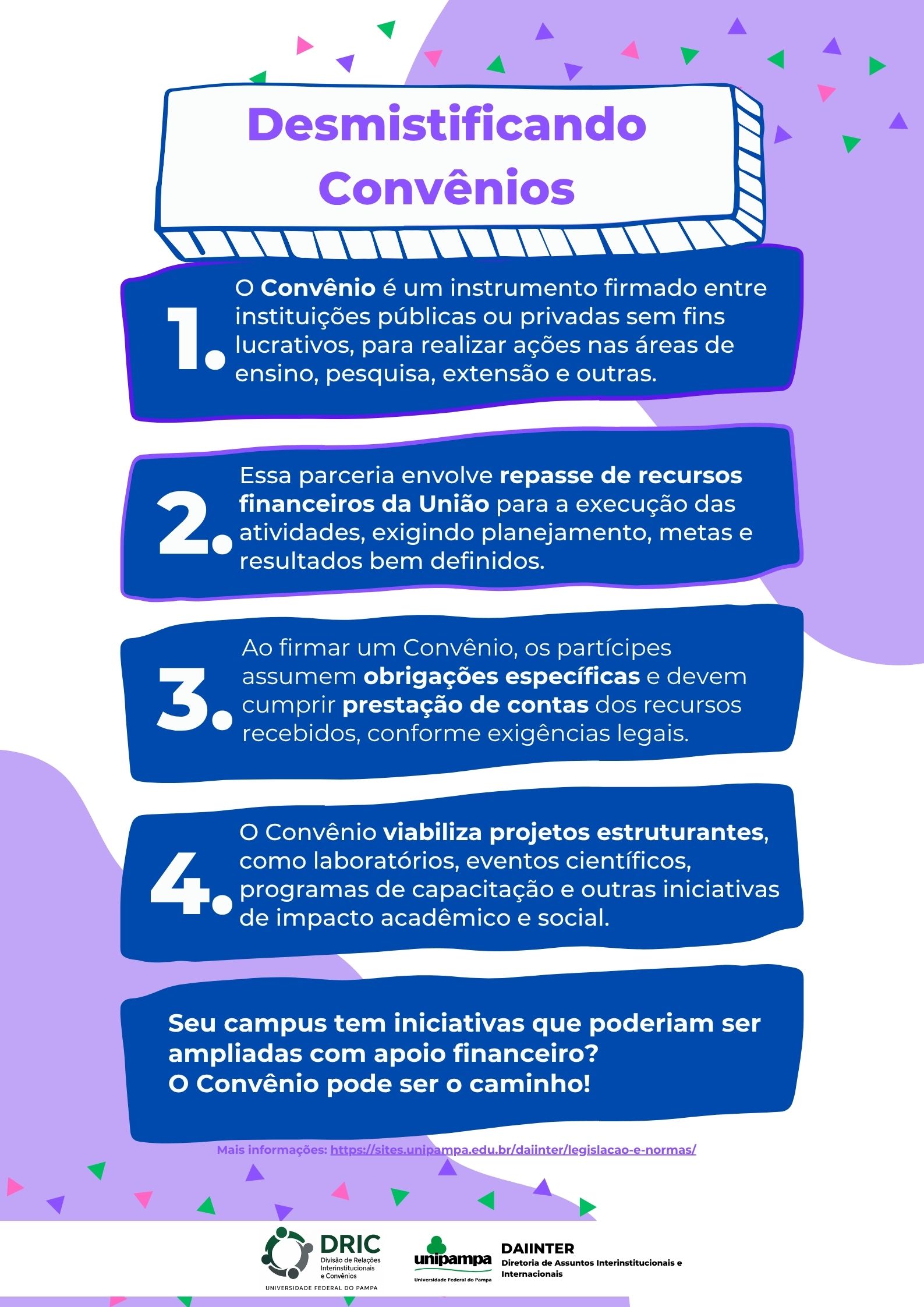 A Divisão de Relações Interinstitucionais e Convênios (DRIC), segue com a série “Desmistificando Convênios”, uma iniciativa que apresenta, de forma simples e objetiva, os principais instrumentos utilizados para formalizar parcerias institucionais.