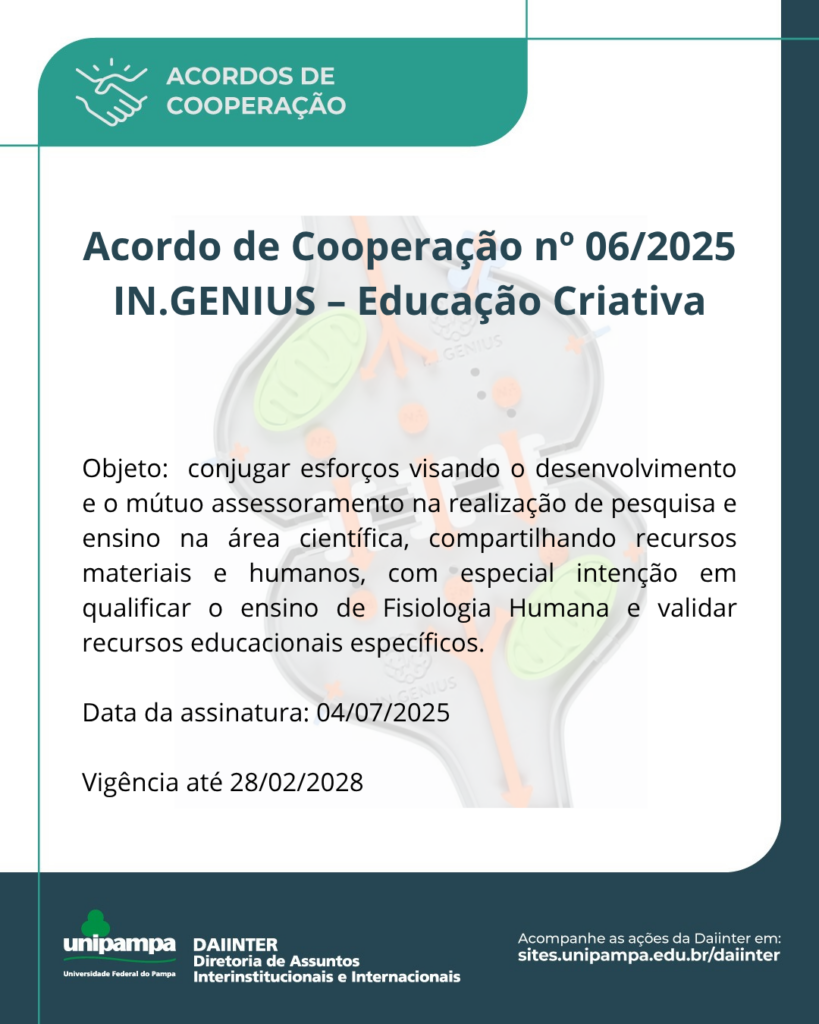 A Unipampa, através do Campus Uruguaiana, firma o Acordo de Cooperação nº 06/2025 com a empresa IN.GENIUS – Educação Criativa, com o objetivo conjugar esforços visando o desenvolvimento e o mútuo assessoramento na realização de pesquisa e ensino na área científica, compartilhando recursos materiais e humanos, com especial intenção em qualificar o ensino de Fisiologia Humana e validar recursos educacionais específicos.