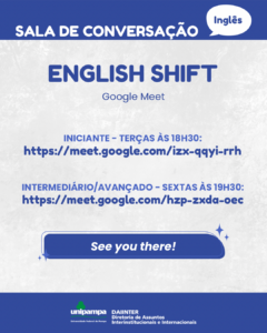 As Salas de Conversação em Inglês e Espanhol, English Shift e Charla Conmigo são promovidas pela Diretoria de Assuntos Interinstitucionais e Internacionais – Daiinter, através do Núcleo de Gestão de Idiomas – NGI.