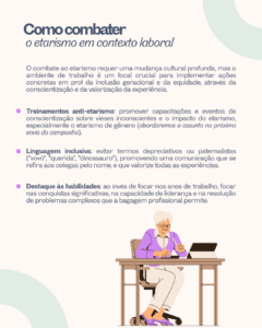 Comentários que desvalorizam e desrespeitam a capacidade de aprendizado ou de liderança favorecem o isolamento profissional e limitam a participação ativa. Isso se deve aos estereótipos relacionados aos(às) trabalhadores(as) mais velhos(as), que são percebidos(as) como pessoas mais estáveis e confiáveis, porém, mais lentas, menos flexíveis e com maiores dificuldades de aprendizado e de treinamento.