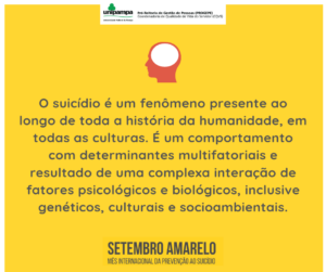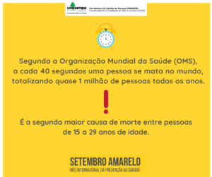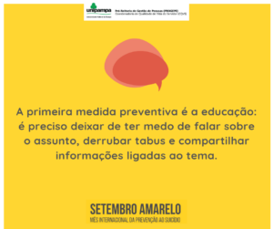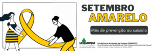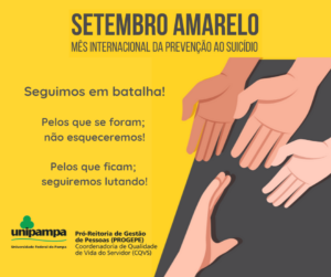 🟨 O mês de setembro, anualmente, veste-se de amarelo para conscientizar a população sobre um tema extremamente importante, porém, que ainda é um tabu em nossa sociedade: o suicídio. Por isso, a Pró-reitoria de Gestão de Pessoas (PROGEPE), através da Divisão de Atenção à Saúde e Segurança de Trabalho (DASST) e da Divisão de Perícias (DP), preparou três materiais diferentes que serão enviados a todos os servidores da Universidade no decorrer deste mês.