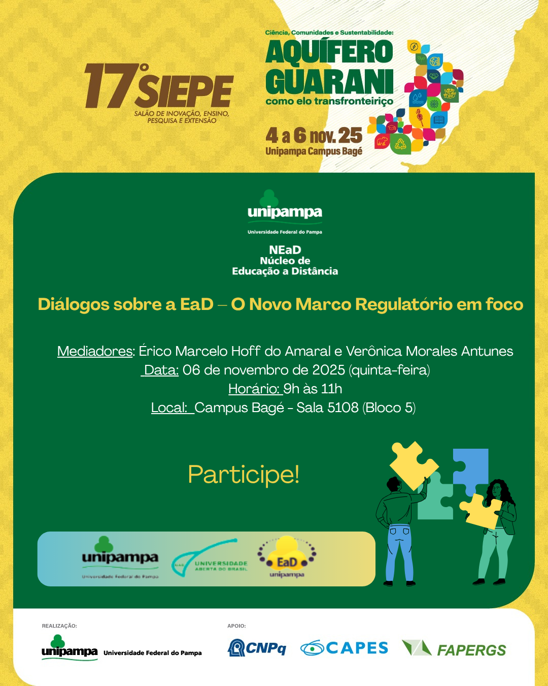 Será um momento fundamental para discussões sobre o novo marco regulatório da EaD e um espaço de diálogo sobre as experiências, desafios e perspectivas da modalidade na Unipampa.