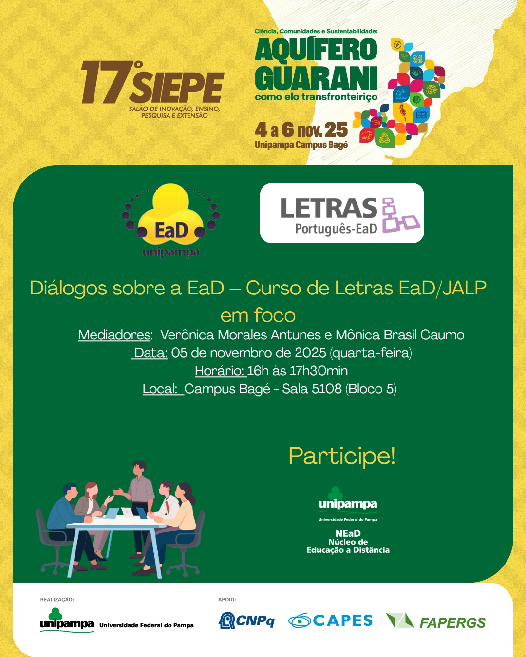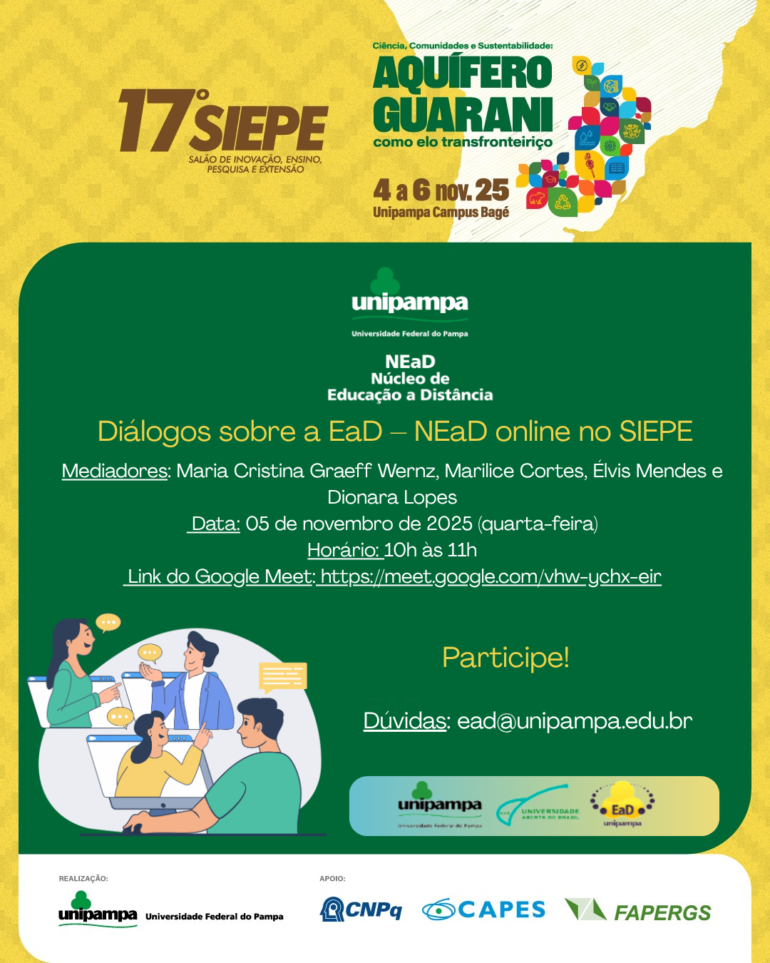 Sua presença e participação são fundamentais para fortalecer as ações da EaD na Unipampa e ampliar a visibilidade do trabalho desenvolvido por nossas equipes e cursos.