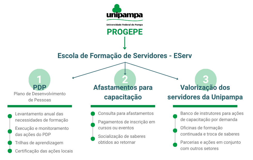 Em face das mudanças ocorridas na estrutura organizacional da Universidade, conforme Portaria nº 1.905, de 27 de dezembro de 2023, a contar de 1o de janeiro de 2024, a Unipampa dispõe de um novo Setor para organizar e ofertar ações de capacitação e desenvolvimento profissional aos servidores, a Escola de Formação de Servidores – EServ.