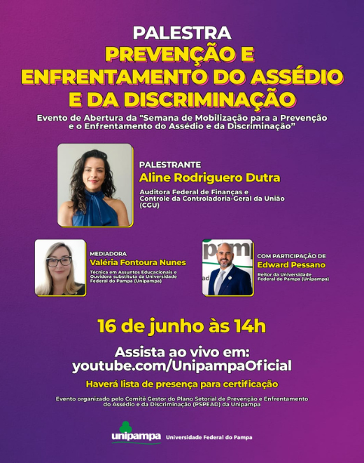 A Palestra é referente ao Evento de Abertura da “Semana de Mobilização para a Prevenção e o Enfrentamento do Assédio e da Discriminação”, que contará com a participação do Reitor, Prof. Edward Frederico Castro Pessano, e a divulgação de cards nas redes oficiais da UNIPAMPA, no decorrer da semana do dia 16 a 20/06.