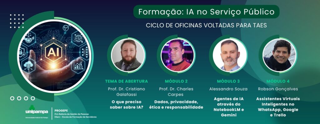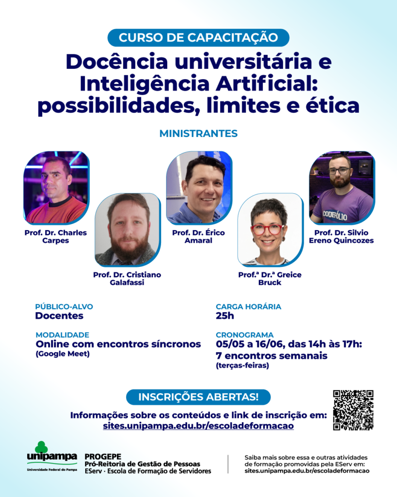 Ementa: Fundamentos da Inteligência Artificial e suas implicações para o contexto universitário, com ênfase na distinção entre dimensões técnicas, sociais, éticas e educacionais. Estudo dos conceitos básicos de IA, com destaque para a diferenciação entre modelos preditivos e generativos, seus modos de funcionamento, limites, potencialidades e impactos no ensino superior. Discussão sobre dados, privacidade, ética, responsabilidade, revisão humana e validação crítica de conteúdos produzidos por sistemas de IA. Análise das relações entre IA, produção de conhecimento e docência universitária. Aplicação prática da IA em atividades de apoio ao ensino e à aprendizagem, incluindo simulações, produção de materiais didáticos, síntese de documentos, recuperação de informações e planejamento de aulas e atividades pedagógicas, com foco no uso crítico, responsável e contextualizado dessas tecnologias.