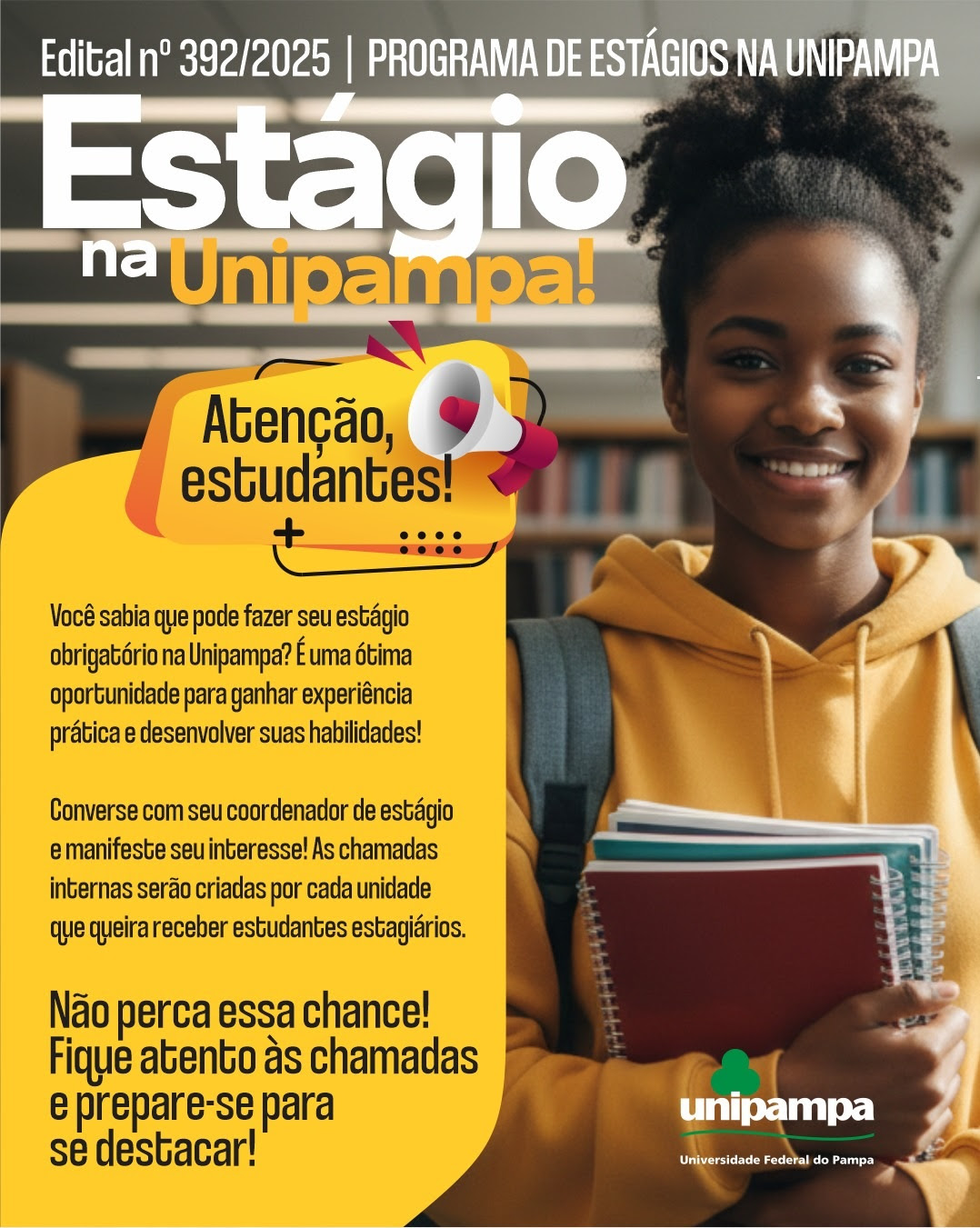 O campus Alegrete, torna pública a abertura de processo de seleção de estágio obrigatório nos termos do Edital Nº 32/2026 do Programa de Estágios na UNIPAMPA. As vagas ofertadas na seleção são destinadas a estágio obrigatório a estudantes regularmente matriculados em cursos de Técnico em Química, externos à UNIPAMPA e as inscrições para candidatos ocorrem nos dias 09/02 a 09/03/2026.