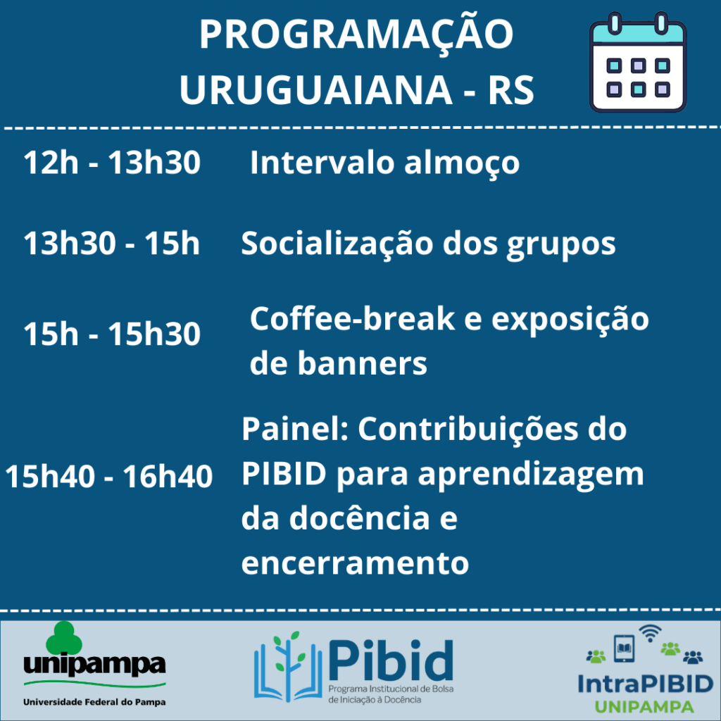 O INTRAPIBID, ação que faz parte do projeto institucional, é fundamental para o desenvolvimento acadêmico e profissional dos pibidianos e, consequentemente, para a melhoria da qualidade do ensino na rede básica e no Ensino Superior. O evento oferece oportunidades valiosas de intercâmbio e atualização sobre práticas pedagógicas desenvolvidas no âmbito do Programa. Nesse edição, o INTRAPIBID será realizado no formato presencial, nos Campi Bagé e Uruguaiana (simultaneamente).