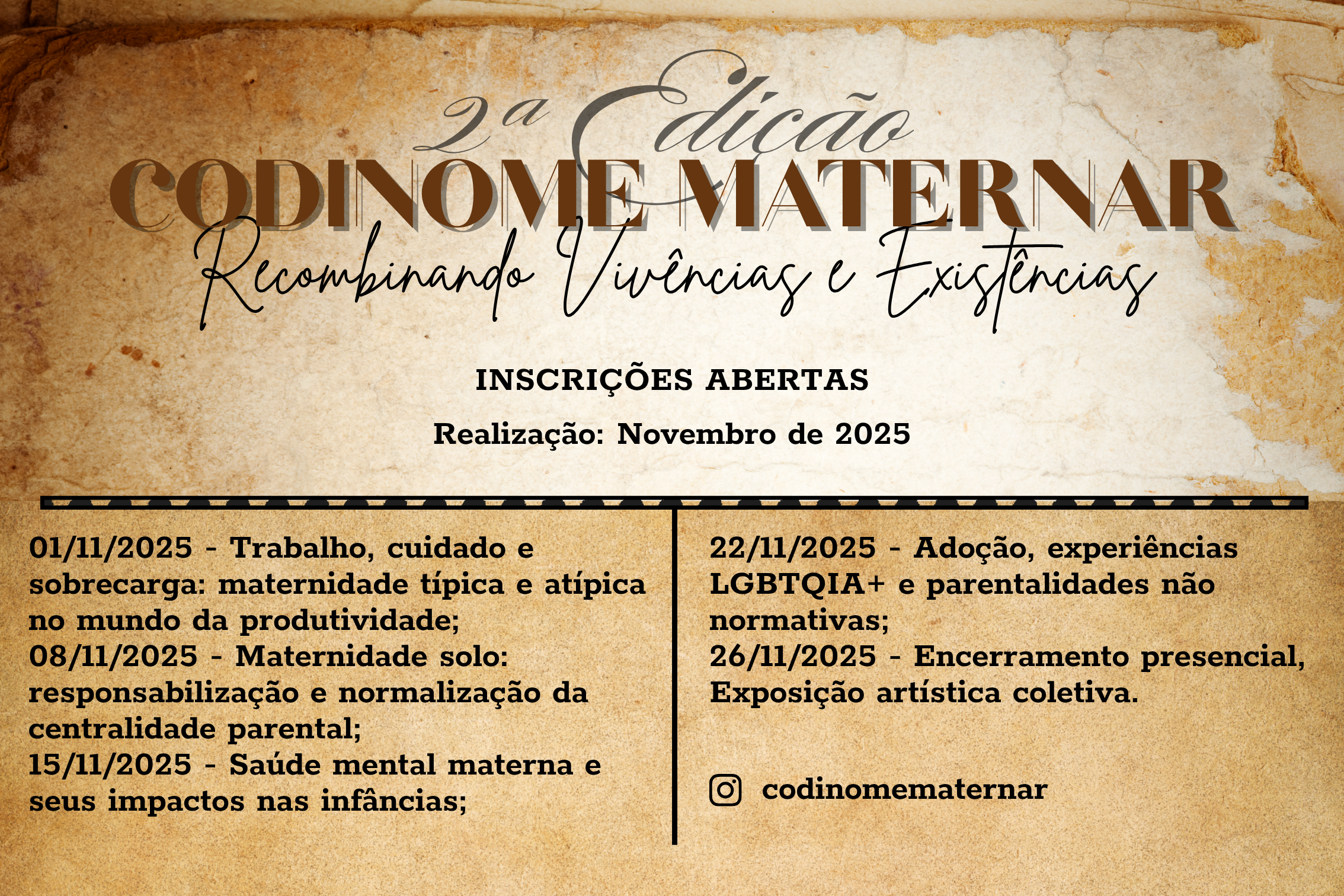 Codinome Maternar 2ª EDIÇÃO: Recombinando Vivências E Existências Data: 01/11/2025 até 26/11/2025 Horário: das 15:00 às 19:00