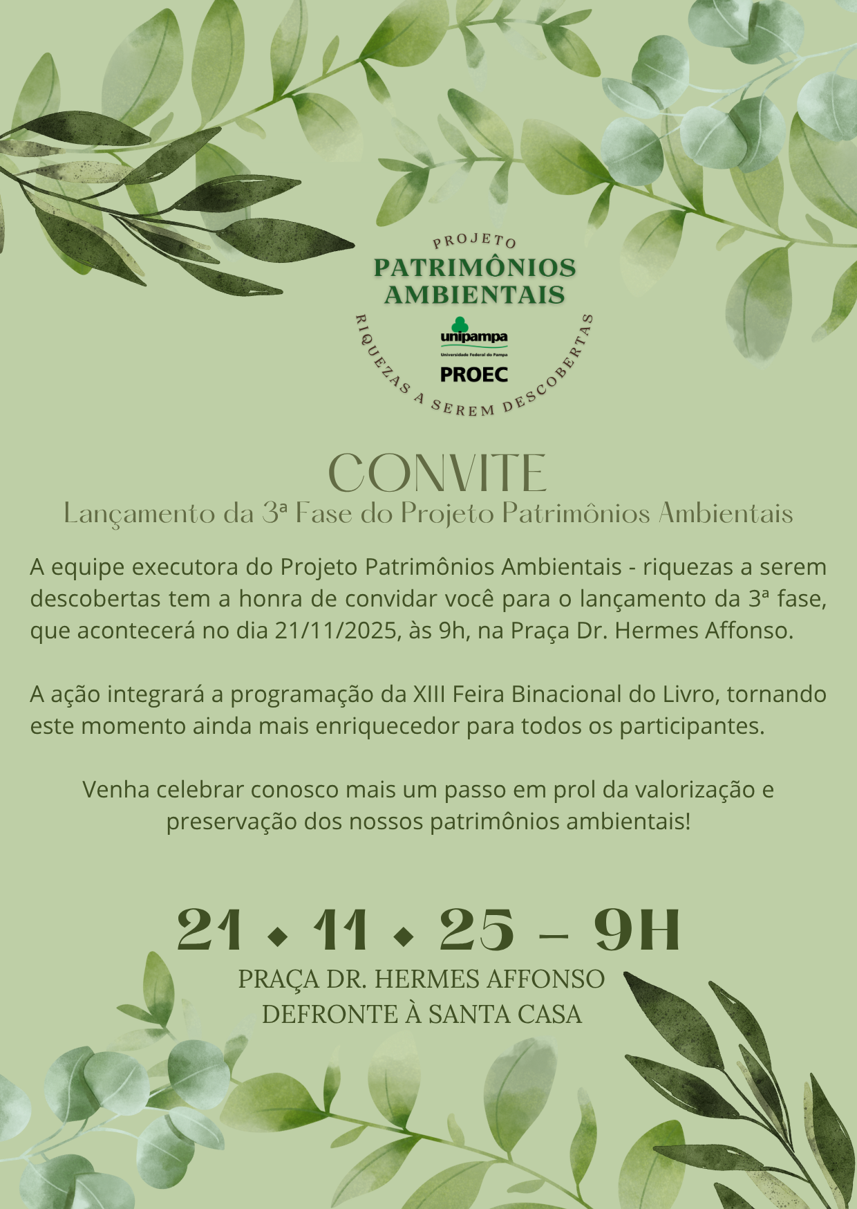 Lançamento 3ª Fase Projeto Patrimônios Ambientais- Riquezas a serem descobertas Data: 21/11/2025 Horário: das 09:00 às 11:00