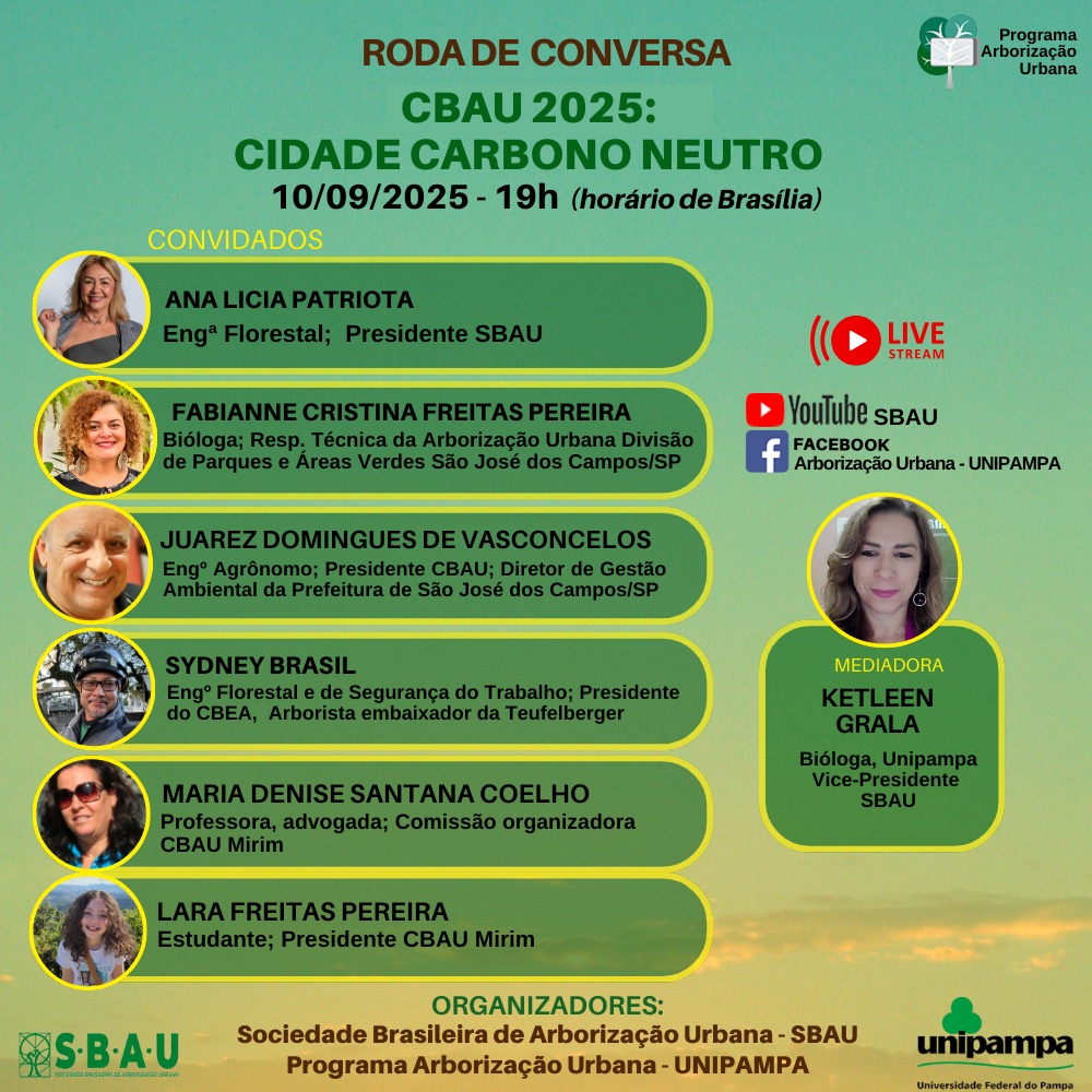 Roda de conversa sobre Arborização Urbana: 🌳*”CBAU 2025 – “Cidade Carbono Neutro”*🌳 Data: 10/09/2025 Horário: das 19:00 às 21:00