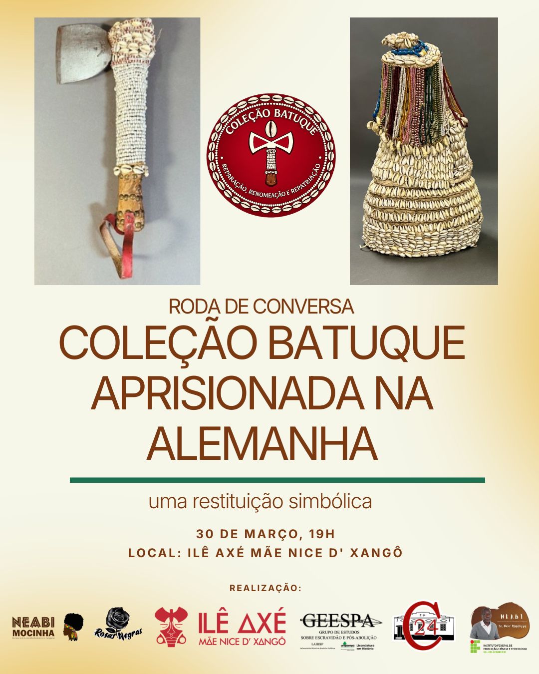 Roda de Conversa “Coleção Batuque aprisionada na Alemanha: uma restituição simbólica” Data: 30/03/2026 Horário: das 19:00 às 22:00