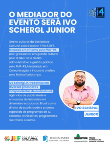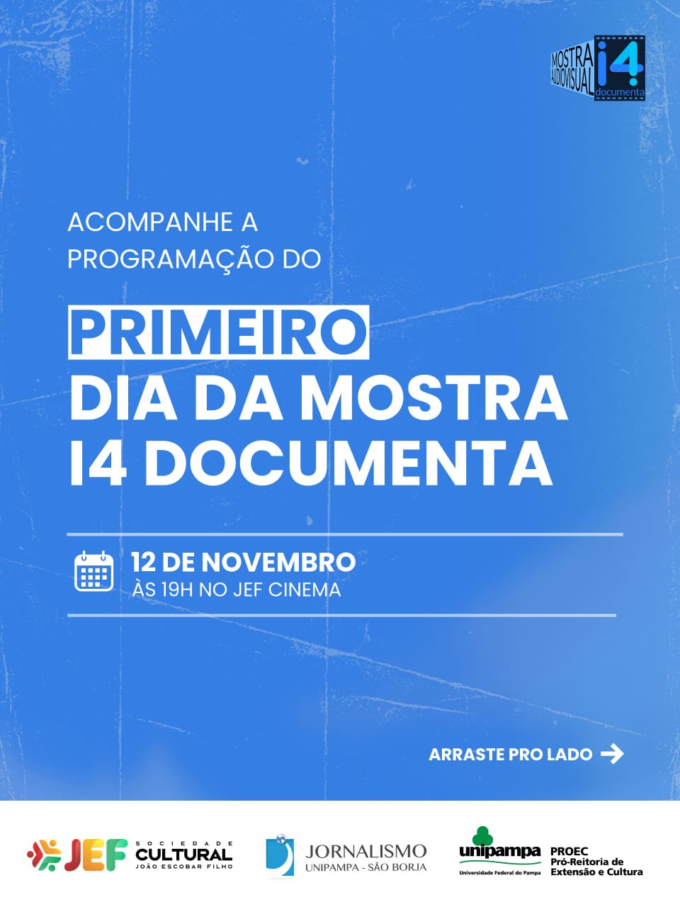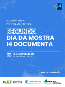 A 3ª Mostra i4 Documenta, que tem como objetivo dar visibilidade às produções audiovisuais realizadas por estudantes do curso de Jornalismo da Universidade Federal do Pampa (Unipampa), acontece nos dias 12 e 13 de novembro, na Sociedade Cultural João Escobar Filho (JEF). O evento é parte das atividades do projeto de extensão i4 Documenta, coordenado pela professora da Unipampa, Sara Alves Feitosa. A ação conta com o apoio da JEF Cinema e a Pró-Reitoria de Extensão e Cultura (PROEC), e será aberto a toda a comunidade.