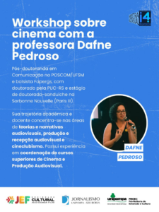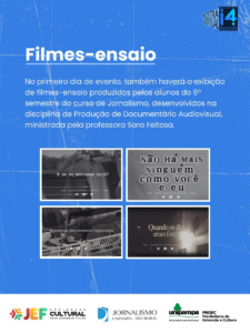O primeiro dia contará com um workshop ministrado pela professora e pesquisadora em consumo e recepção de cinema Dafne Pedroso, além da exibição de filmes-ensaio produzidos pelos estudantes do 6º semestre de Jornalismo, na disciplina de Produção de Documentário.