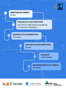 Encerrando a programação, será exibido o documentário “Agyuje”, produzido pelos discentes Bárbara Mendes, Danilo Oliveira, Elis Regina Rodrigues, Gustavo Bragança e Mariana Erthal, em 2024, trazendo como tema a história dos povos Guaranis na Fronteira Oeste, abordando a dizimação desses povos e a resistência para a preservação da cultura.
