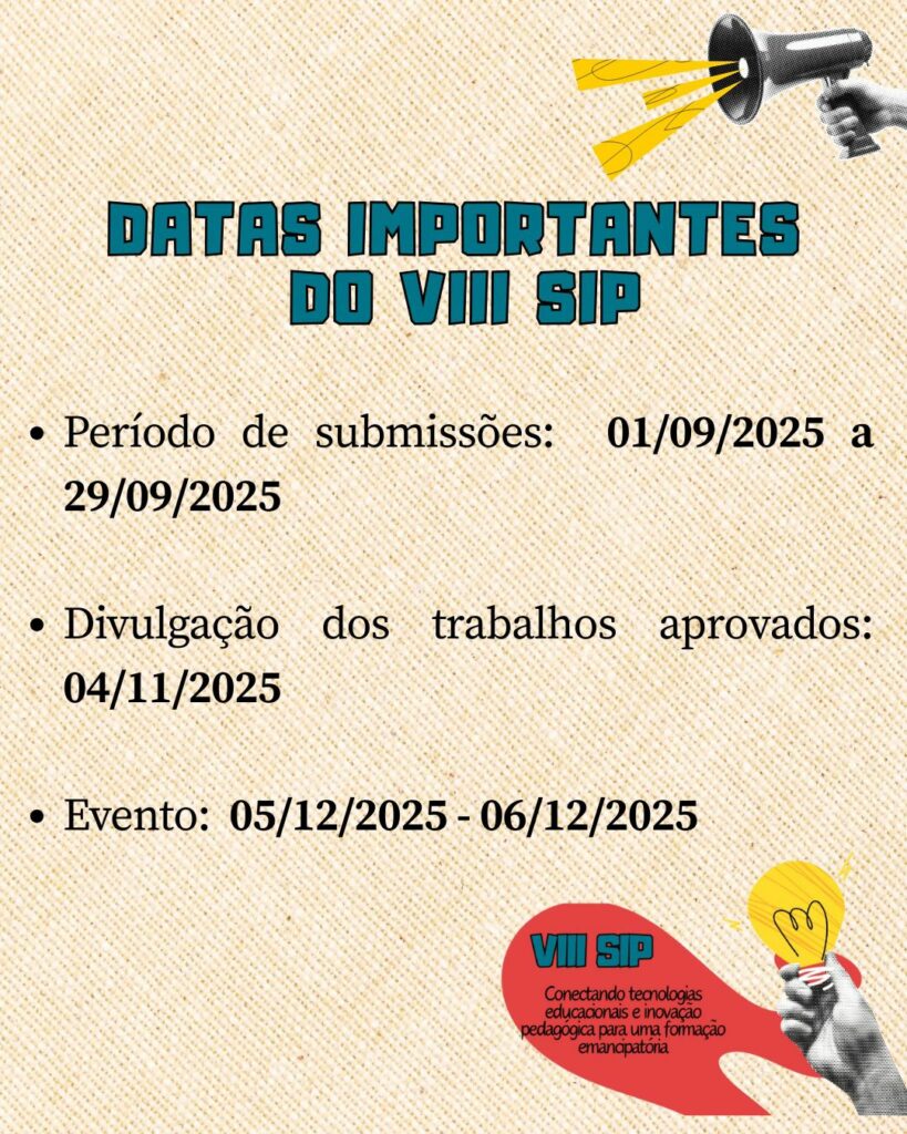 O VIII Seminário de Inovação Pedagógica (SIP) neste ano traz como temática “Conectando tecnologias educacionais e inovação pedagógica para uma formação emancipatória“.