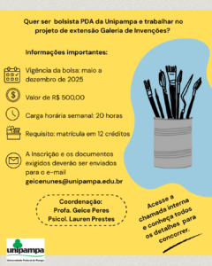Quer fazer extensão com muita arte e interação com a comunidade? Te inscreve na Chamada Interna do Projeto de Extensão Galeria de Invenções – 2ª edição, coordenado pela professora Geice Peres Nunes e pela psicóloga Lauren Cassol Prestes.