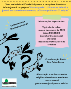 O projeto No campo da LIJ – 2ª edição seleciona 01 (um) bolsista de pesquisa, discente de cursos presenciais do campus Jaguarão. A chamada interna está disponível no link:
