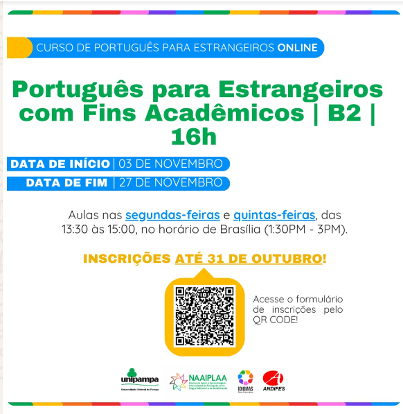 Inscrições para o novo curso de nível B2 – 16h “Português para Estrangeiros para Fins Acadêmicos”