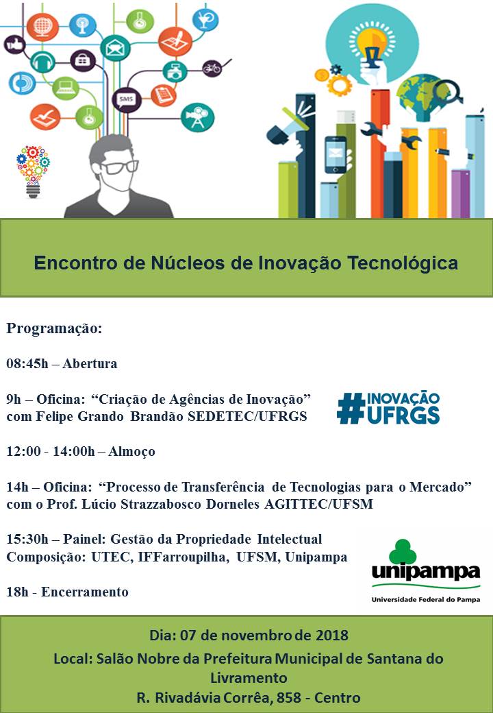 Estão abertas as inscrições para o Encontro de Núcleos de Inovação Tecnológica. O evento tem como objetivo a troca de experiências e o fortalecimento dos NITs. O Encontro será no dia 07 de novembro no Salão Nobre da Prefeitura Municipal de Santana do Livramento, durante o 10º Salão Internacional de Ensino, Pesquisa e Extensão.