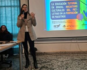 Em sua fala, a tutora do PET-Letras, professora Carolina Fernandes, reiterou a importância das iniciativas culturais na formação de professores. Conforme a docente, tais iniciativas enriquecem a formação acadêmica e fortalecem o vínculo entre a Universidade e a comunidade.