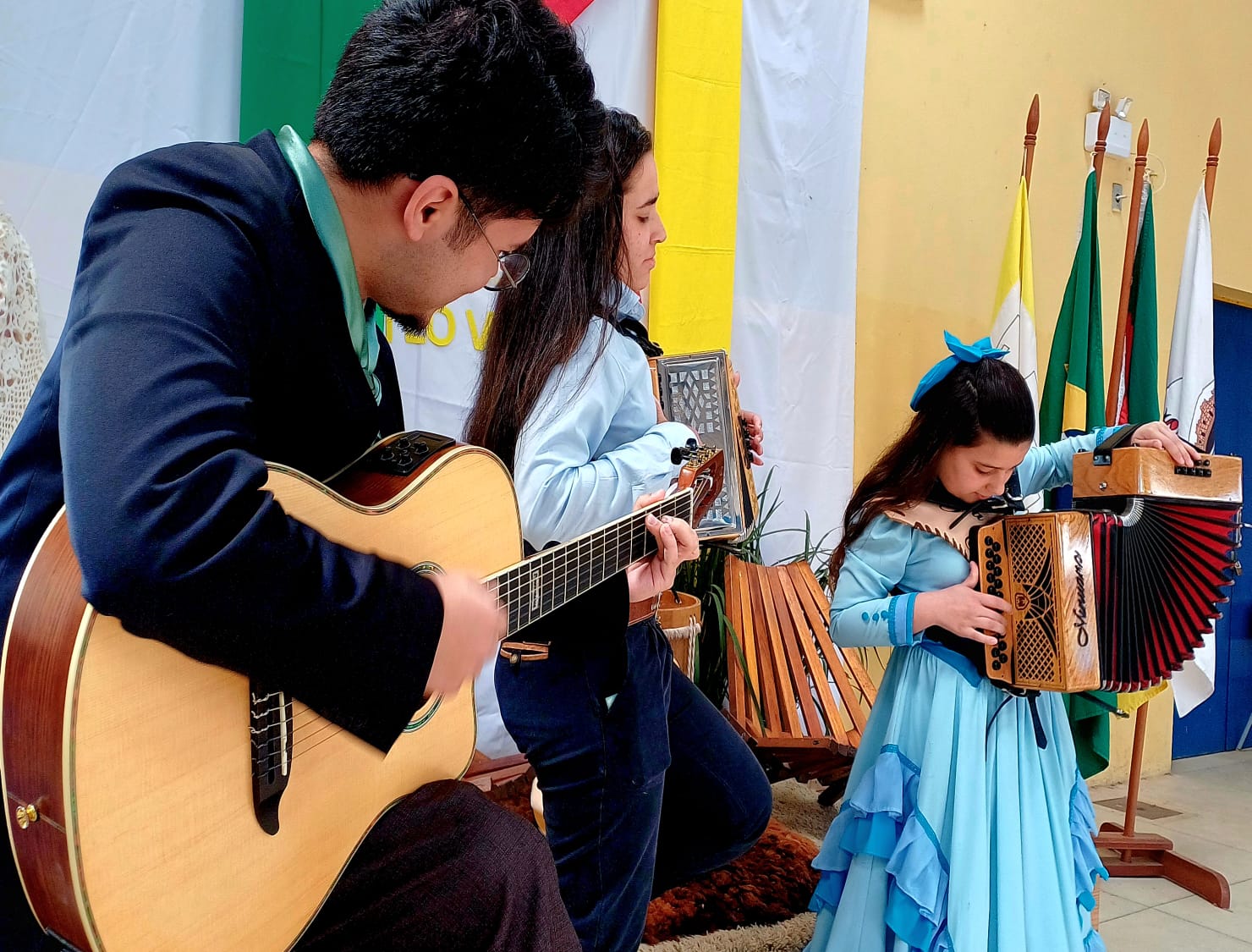 “Orgulho de fazer parte da abertura da Semana Farroupilha na EMEF Téo Obino em Bagé! Nosso grupo do Pibid de Música marcou presença com uma linda apresentação de violão, que contou com o talento do Pedro Lucas Reis de Aquino ,e outras instrumentistas, e o apoio de todos os participantes do grupo, abrilhantando ainda mais o evento no dia 13 de setembro.”