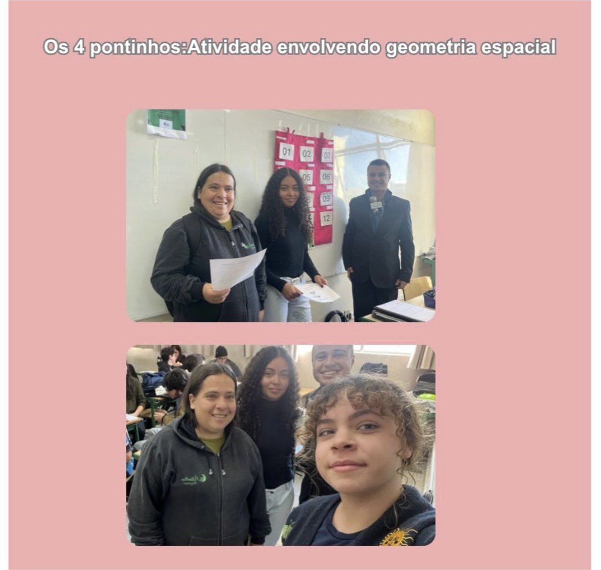 Na prática, os alunos sorteavam dicas que descreviam características de figuras geométricas. A missão era descobrir qual sólido estava sendo descrito — entre prismas, pirâmides, corpos redondos e os sólidos de Platão.