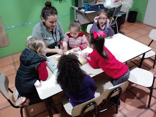 Na segunda atividade os alunos utilizaram de vários brinquedos pedagógicos que foram emprestados pela UNIPAMPA, com informações relativas aos alimentos para estimular algumas habilidades junto à construção do conhecimento.