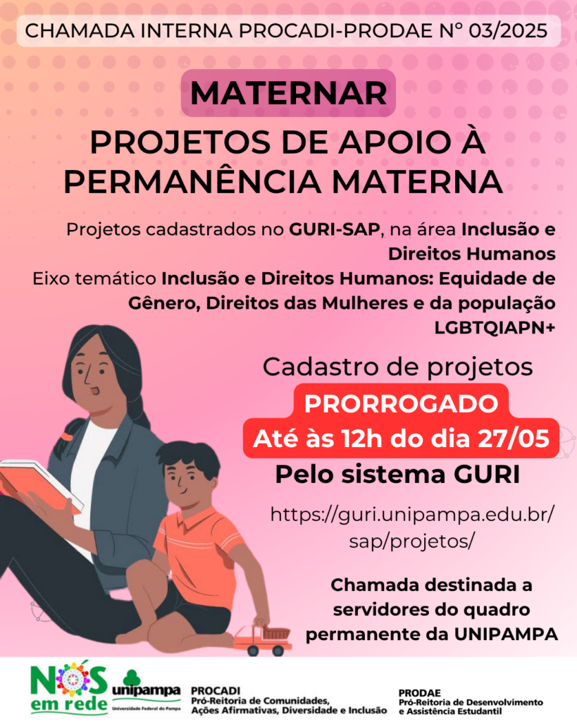 A Pró-Reitora da Pró-Reitoria de Comunidades, Ações Afirmativas, Diversidade e Inclusão (PROCADI) e a Pró-Reitora da Pró-Reitoria de Desenvolvimento e Assistência Estudantil (PRODAE) da Universidade Federal do Pampa tornam pública a Chamada para seleção de projetos de apoio à permanência materna, em uma ação interseccionalizada com a política de e para mulheres.