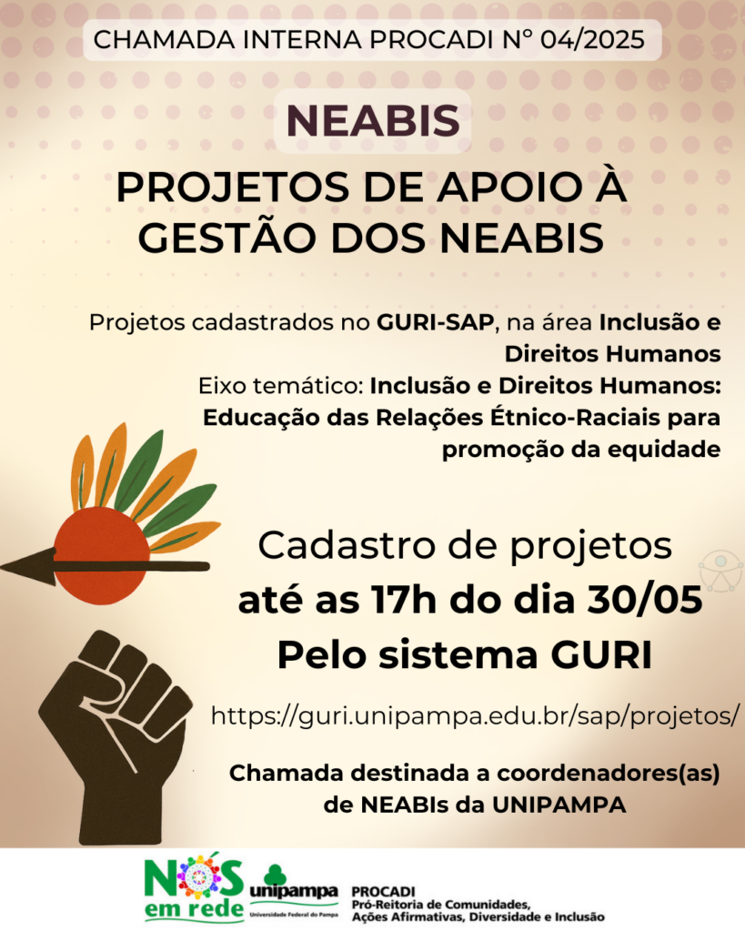 A Pró-Reitora da Pró-Reitoria de Comunidades, Ações Afirmativas, Diversidade e Inclusão da Universidade Federal do Pampa (UNIPAMPA) torna pública a seleção de bolsistas para o desenvolvimento de atividades híbridas (on-line e/ou presenciais) de apoio à gestão dos Núcleos de Estudos Afro-brasileiros e Indígenas (NEABIs).