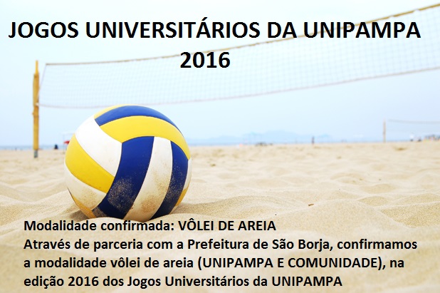 O secretário Lucas Amaral confirmou a parceria com a Universidade, cedendo a arbitragem, com isso já é possível anunciar o vôlei de areia na Edição dos Jogos Universitários da UNIPAMPA 2016.