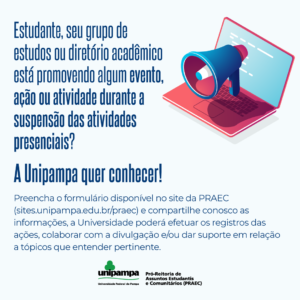 A PRAEC está realizando um acompanhamento das ações e eventos promovidos pelos discentes durante a Pandemia COVID-19.