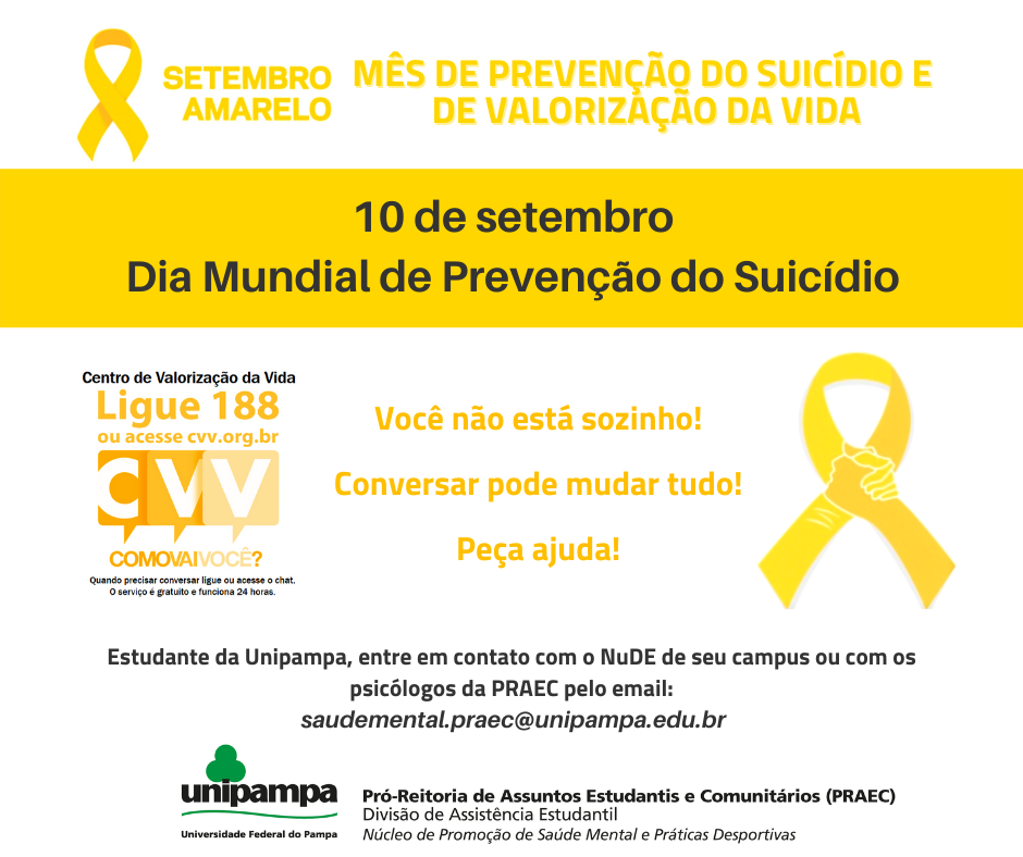 Estudante da Unipampa, procure o NuDE do seu campus ou entre em contato com os psicólogos da PRAEC através do e-mail: saudemental.prodae@unipampa.edu.br