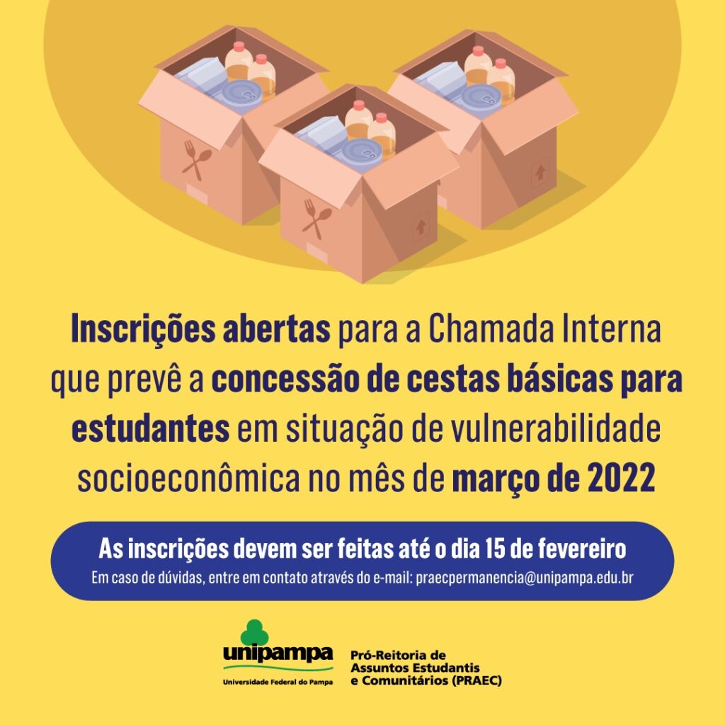 A PRAEC informa que estão abertas as inscrições para a Chamada Interna PRAEC Nº 11/2021 que prevê a concessão de cestas básicas para estudantes em situação de vulnerabilidade socioeconômica para o recebimento no mês de MARÇO de 2022, conforme cronograma a seguir: