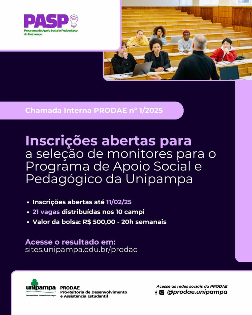 Estão abertas as inscrições para a seleção de monitores para o Programa de Apoio Social e Pedagógico da Unipampa (PASP).