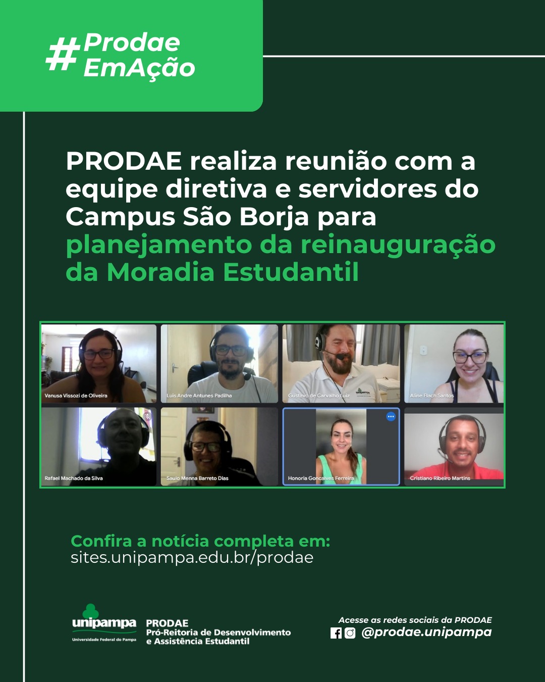 No dia 5 de fevereiro de 2025, a Pró-Reitoria de Desenvolvimento e Assistência Estudantil (PRODAE) da Universidade Federal do Pampa (Unipampa) participou de reunião com os membros da equipe diretiva do campus São Borja e demais servidores para tratar de discussões relacionadas à Reinauguração da Moradia Estudantil, prevista para ocorrer em março.