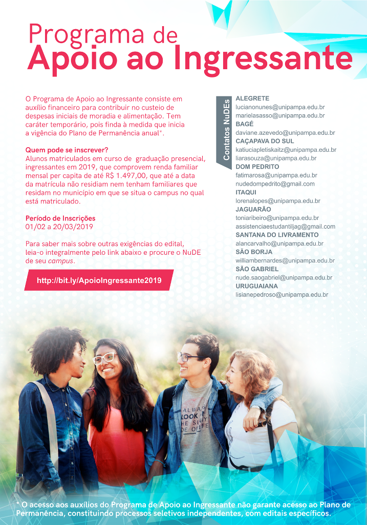 Edital Unipampa n.º 70/2019 – Projeto de Apoio Social e Pedagógico da Unipampa – PASP 15 de março de 2019 Sem categoria A PRAEC divulga o Edital do Projeto de Apoio Social e Pedagógico da Unipampa – PASP, edição 2019: Edital Unipampa n.º 70/2019